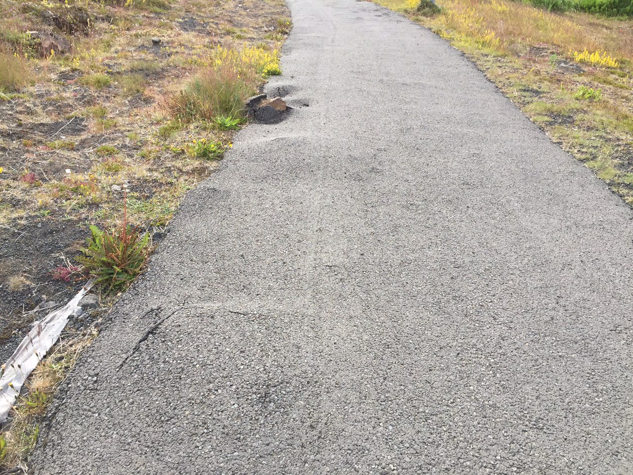 Á meðfylgjandi myndum má sjá hvernig ástandið er víða en þessar myndir eru teknar í Áslandi og í Hvömmunum, í öllum þessum tilvikum er ástandið svona á stígum sem eru í brekku og er því hættan enn meiri þegar reiðhjólafólk er á meiri hraða.