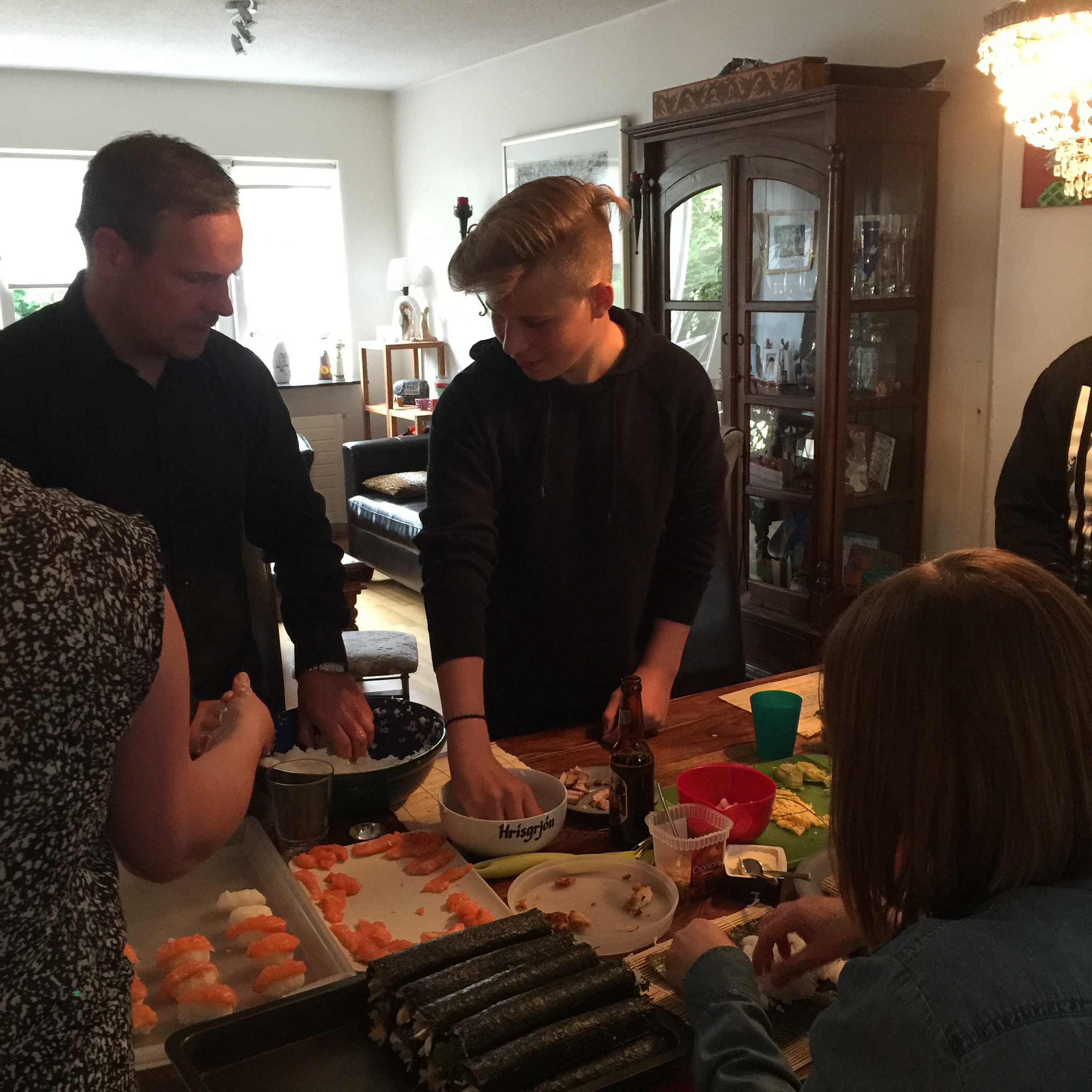 Í maí var ég aftur á ferðinni og í þetta skiptið til Stokkhólms, Oslo og Kaupmannahafnar. Guðmundur Adam byrjaði að æfa Badminton og er þar enn ásamt handboltanum. Ómar, Kidda og fjölskylda komu með okkur í sushi gerð sem tókst bara nokkuð vel til og smakkaðist vel. Allir smökkuðu eitthvað en voru mishrifin. Við skelltum okkur á bílasýningum og mátaði Guðmundur sig við nokkra bíla sem hann ætlar sér að kaupa fljótlega eftir 17 ára afmælið skildist mér. Guðmundur dró svo mömmu sína með sér í veltubílinn.