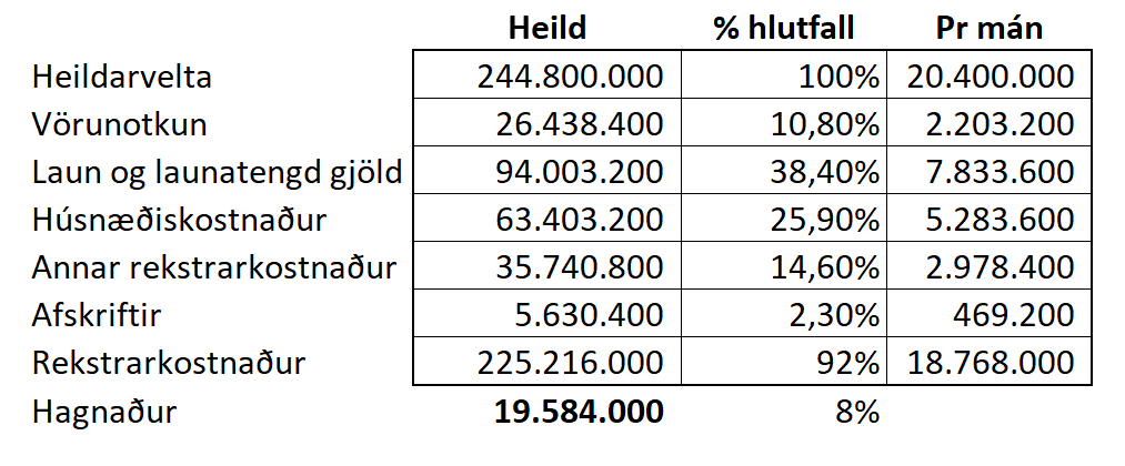 Til að finna út hver fasti kostnaðurinn á þessu hóteli er þá miðum við við það að meðalverðið hjá þeim hafi verið 25.000 kr í fyrra. Nokkuð lægra yfir vetrarmánuðina en þó nokkuð hærra yfir sumarmánuðina. Þetta gefur okkur þennan rekstrarreikning.