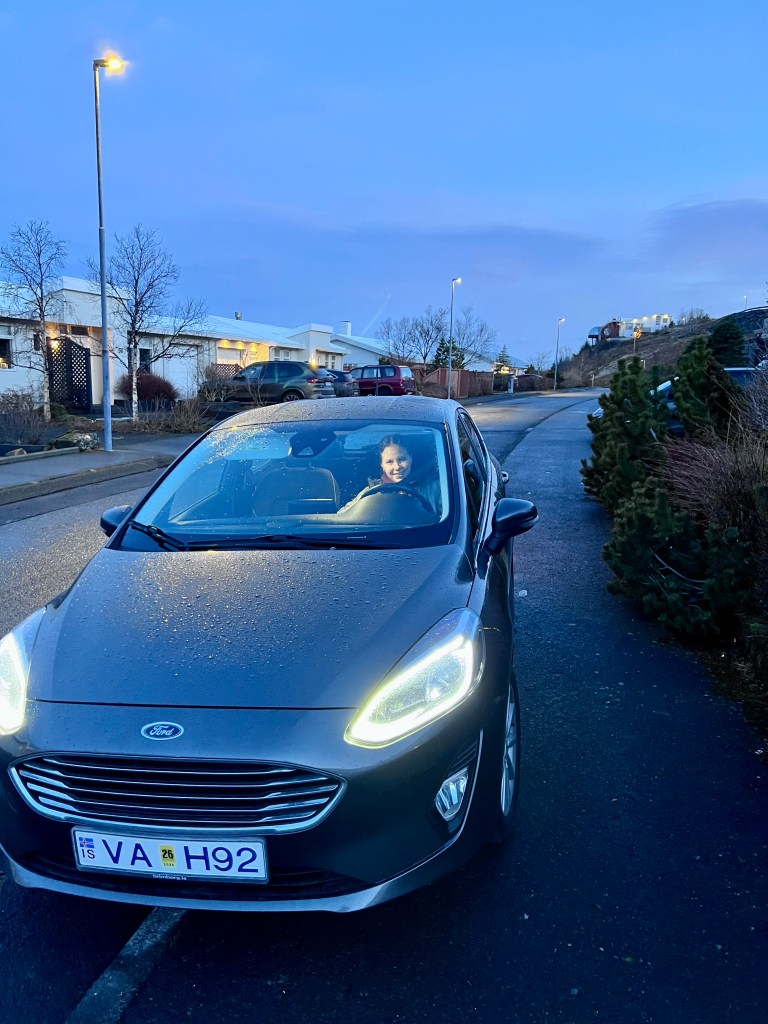 Lena var búin að stunda ökunámið af krafti og því var kominn tími á að kaupa bíl. Fínn Ford Fiesta varð fyrir valinu og fékk hann að bíða á planinu í nokkra daga eftir að hún fékk prófið en hún náði bæði verklega og bóklega tímanlega og fékk því að bíða.